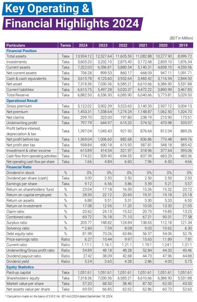 For the year ended December 31, 2020, the Company earned gross and net premium income Tk. 2,937.12 million and 1,062.50 million respectively. The total asset amounts to BDT 10,277.90 millions with an up-ward trend @ 14.20%. A cash dividend of 25% was distributed to valued shareholders for the year ended December 31, 2020. Furthermore; CRISL awarded RIL “AAA” (Triple 'A' indicating highest claim paying ability) in Surveillance Rating based on financials up to December 31, 2019 and other qualitative and quantitative information was up to the date of rating on December 31, 2020